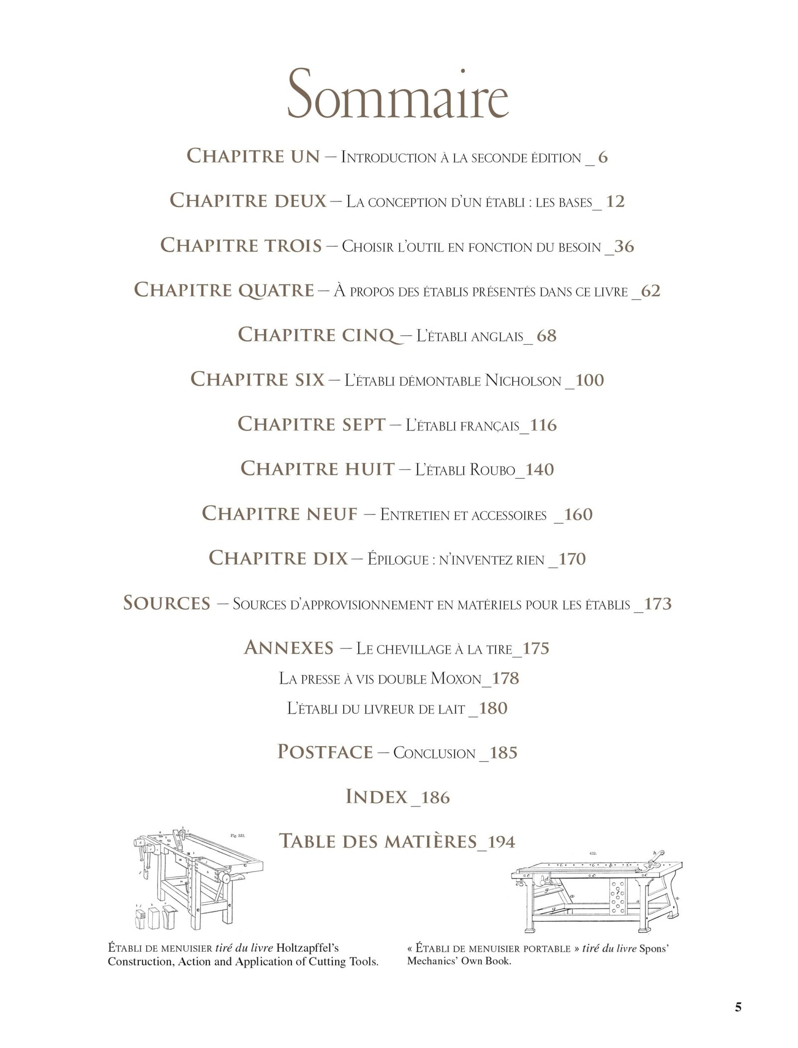 Qui n’a jamais pensé faire son propre établi? Facile! Quatre pieds, des traverses, un plateau, et c’est bon… Donc on pourrait tout aussi bien l’appeler “une table de salon”… Et si une table de salon suffisait pour travailler le bois? Réfléchissons… Comment immobiliser une planche sur une table de salon pour travailler ses chants, ses faces et ses bouts? Pas simple. Et comment scier, raboter, ou travailler à la défonceuse sur une table de salon? Pas évident non plus… Et comment fixer une grande pièce, ou une petite pour qu’elle soit poncée ou rainurée? C’est là, toute la différence entre un établi et une table de salon. L’un est capable de s’adapter à toutes ces situations, et l’autre pas. L’un est un outil de travail et l’autre un endroit où manger, boire, passer du temps en famille. Bien conçu, l’un vous tiendra toute une vie et… l’autre aussi. Ce livre extrêmement bien pensé aide à concevoir et à fabriquer l’établi qui vous conviendra. Non pas un établi fantaisiste, mais un établi simple, robuste, évolutif, adapté à votre physionomie, à votre façon de travailler, à votre budget et surtout, qui répond aux attentes essentielles de tout établi digne de ce nom. Tout y est, de la réflexion sur la conception, à l’utilisation et la fabrication pas à pas d’accessoires de serrage, et de cinq modèles différents (tous les plans détaillés sont fournis): L’établi décrit par André-Jacob Roubo, un établi français inspiré du précédent, un établi anglais, un établi Nicholson montable et démontable en moins de 10 minutes et un établi portable: l’établi du livreur de lait. Comment concevoir un établi? Quel établi? Quels accessoires utiliser? Quels bois utiliser? Quels assemblages? Ce livre, entre dans le vif du sujet. Ce n’est pas un livre qui présente de beaux établis à travers le monde, c’est un livre utile et efficace. L’auteur partage, au travers de ces 200 pages dont 25 de plans, et plus de 350 photos, plus de quinze années de recherche, d’expérience et de fabrication d’établi. Il s’agit là du sujet favori de Christopher Schwarz, toujours à la recherche d’optimum, s’inspirant des techniques modernes mais aussi des traces du passé. C’est l’un des nombreux livres qu’il a écrit sur le sujet, aujourd’hui en français. Alors plongez-vous dans ce livre, sortez vos outils et faites un bon établi, vous ne le regretterez pas.